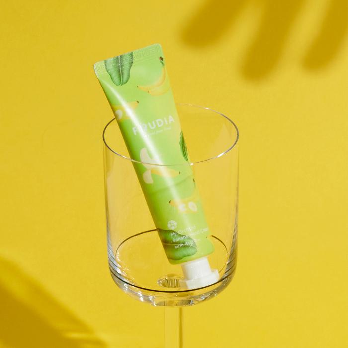 Крем для рук FRUDIA MY ORCHARD BANANA HAND CREAM дарит нежной коже рук комфорт, моментально увлажняет, глубоко питает, смягчает огрубевшие зоны, устраняет сухость и шелушения. Он разглаживает кожу рук, запускает процессы регенерации, уменьшает морщинки и заломы, повышает упругость и эластичность. Крем окутывает кожу приятным ароматом свежего банана, поднимает настроение и заряжает положительными эмоциями на весь день. В состав крема входит масло ши, которое известно своими регенерирующими и омолаживающими свойствами, поможет смягчить и напитать кожу. Аденозин помогает повысить упругость кожи и ускоряет синтез коллагена. Комплекс масел поможет укрепить иммунитет эпидермиса, оздоровить микробиом, улучшить защитные функции кожи. Витамин Е помогает поддерживать уровень влаги в коже, делает ее гладкой и шелковистой. Растительные экстракты освежают кожу, придают ей тонус, насыщают полезными веществами и витаминами, способствуют скорейшему заживлению ранок и повреждений. Крем быстро впитывается, моментально смягчает кожу, дарит ощущение комфорта и приятный сладкий аромат.